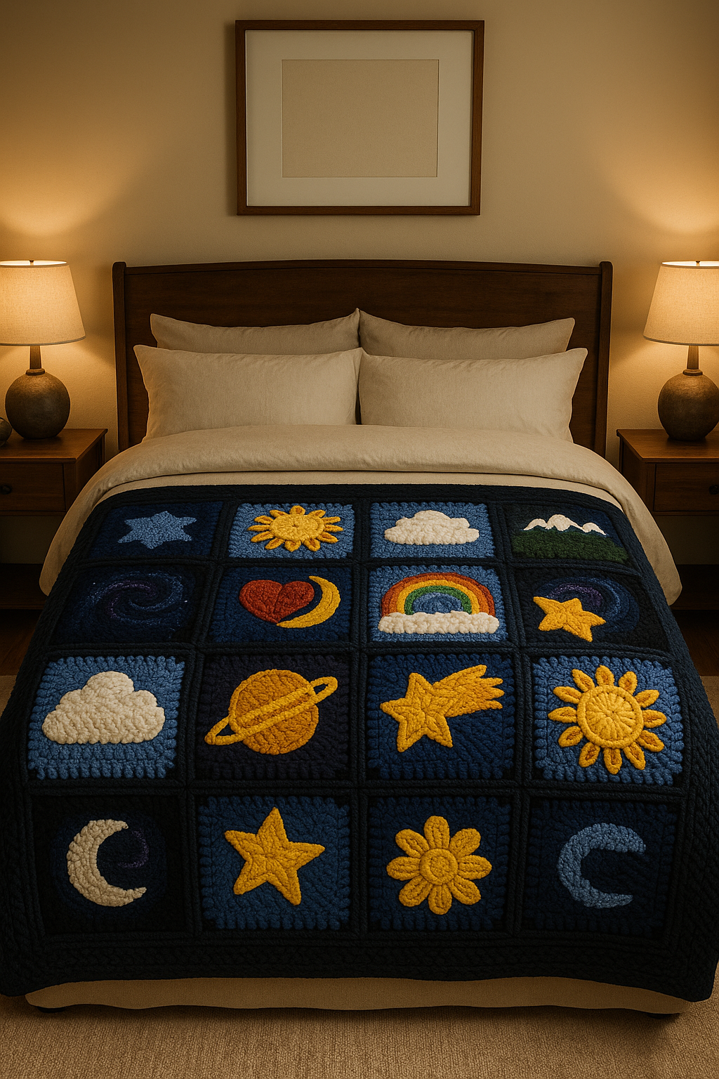 Transform your yarn into the cosmos with this magical collection of celestial-themed granny squares! Perfect for blankets, wall hangings, bags, or as individual statement pieces.